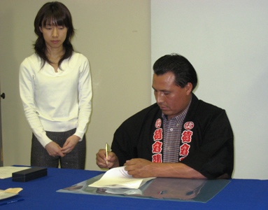 当社のはっぴをまとって調印するミルトン・コパ灌漑課長