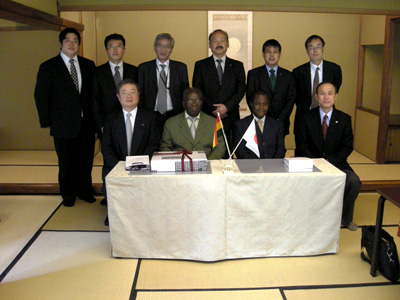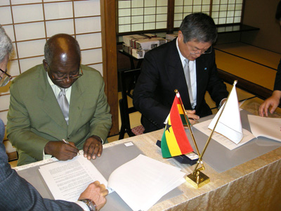 名古屋の由緒ある老舗料亭「八勝館」にて、ガーナ道路公社アボアジェ総裁と当社徳倉社長により、コンサルタント「アンジェロセック社」の立ち会いの下、契約調印が行われた。
