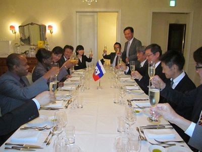 乾杯の発声を荒金本部長が行い、ハイチ共和国の標語である「団結は力なり」を全員で唱和し、食事中には当社の海外工事の実績をお伝えするなど、有意義な食事会となりました。