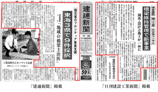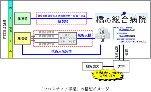 国土交通省の「フロンティア事業」(建設企業の連携の強化を図り、維持管理、エコ建築、耐震、リフォームなどの成長が見込まれる市場の開拓を図る企業を支援する事業)に応募し、当社と瀧上工業(株)および大日本コンサルタント(株)の共同企業体が選定されました。 平成24年12月末までの活動予定で、主に官・学・民が一体となり、維持補修事業の工事モデルケースを作り、自治体などを対象に普及活動を行い、将来のビジネスモデルの確立を目指していきます。