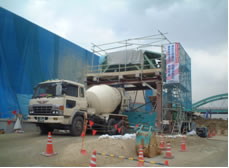 現場発生土を使用して、現場に設置したプラントで流動化処理土を製造し、アジテータ車で場内運搬。直投・ポンプ車にて打設、埋戻し。