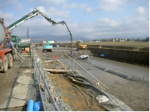 現場発生土を使用し、現場プラントで流動化処理土を製造、アジテータ車にて運搬し、各現場に配送。打設はポンプ車にて実施(元請により施工)。