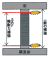 SRF工法は、しなやかで強靭なポリエステル繊維のベルトやシートを、ウレタン系一液性無溶剤接着剤で鉄筋コンクリート(RC)の柱、壁等に貼り付け、巻き付ける工法です。鉄筋コンクリートの損傷と破壊を直接防止し、新材料(Recovered Reinforced Concrete:R2C)と呼べる程の強靭性を付与することが、各種の実験で確認されています。コンクリートをしなやかで切れない材料で被覆することを耐震被覆と呼んでいます。SRF工法は包帯補強とも呼ばれています。