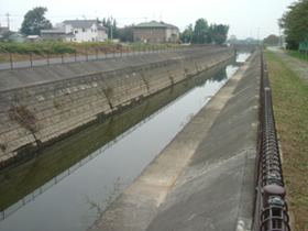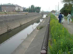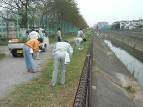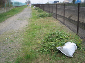 作業チームを用水路の左岸側と右岸側に分けてゴミ拾いおよび草刈りを行いました。前回は熱中症が危惧され途中までしか草刈りが出来なかったため、残りの半分を今回行いました。