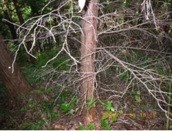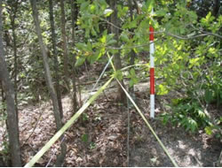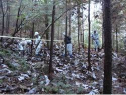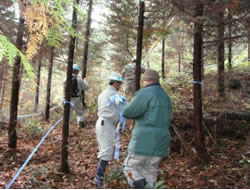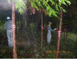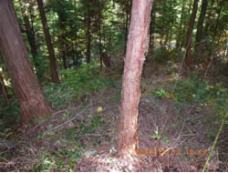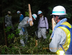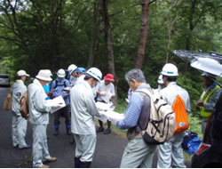 愛知県県有林事務所職員の方の現地指導をお願いしました。注意事項をはじめ、林分調査の手法や、間伐、除伐、枝打ちの方法や樹種、草本の名前などを教えていただきました。つぎに協定区域の現地特定です。15000uの狭い区域ですが、伐開しながらテープを張りました。かなり急峻なところもあり、とりあえずは道路沿いの緩やかな斜面から活動をすることにしました。活動時間10:00〜12:00、参加者は担当の5名でした。