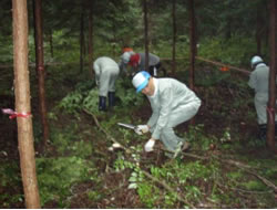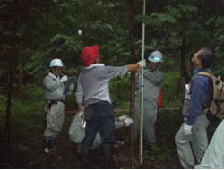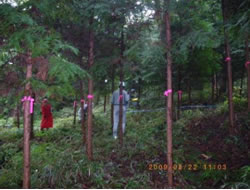 参加者を2班に分けて、毎木林分調査です。この森はヒノキと背丈の高い広葉樹との混交になっており、比較的暗いところを対象区画として選定しました。まず除伐するべきヒノキを切り、樹高の目安と年輪による樹齢を調べました。樹高調査は手作りの樹高計やスタッフを用いましたがこれが一番苦労しました。途中で雨が降ってきて野帳が濡れ、泣きたくなりましたが、それでも何とか終えました。林分調査の結果は別表の通りです。広葉樹の日陰になっているためか成長が遅く間伐本数は0と出ました。この次は少し明るいところで行います。作業終了後近くの温泉で汗を流しました。活動時間9:00〜12:00、参加者は1組の夫婦を含め14名。