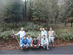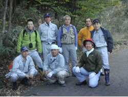 また間伐は当面しないということなので作業の安全を考えチェンソーは使用しないで手鋸と鎌だけにしました。道路そばのヒノキ以外の潅木のなす景観の整斉は次の秋の観察を待って考えることとし、今回は道路から20mの幅を残してそれから奥の枝打ち、除伐を行う計画としました。またシイタケ栽培を計画しましたのでコナラを切って「ほだ木」も作りました。手鋸でのコナラ切りは時間がかかり苦労しました。しかしシイタケが実ることを想像しみんながんばりました。適齢期となった枝打ちは快調に進み、20mの幅ではありますが少し見通しが良くなった気がし、とっても気持ちが良くなりました。活動時間9:00〜13:00、参加者は10名