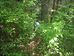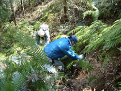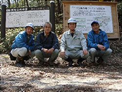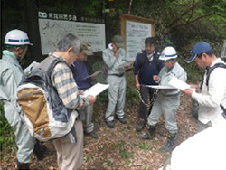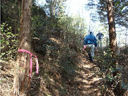 今回は10名の参加があり、今までの活動延べ参加者数は210名となりました。今回は(1)枝打ちや急な斜面を上り下りしやすいよう手すりとなるロープの取付(森の整備)と、(2)5月26日の徳倉・森の教室に向けての準備として、岩屋堂への散策および下見(徳倉・森の教室の準備)、の2班に分かれて活動を行いました。