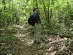 活動エリア東側には東海自然歩道があります。それを伝っていくと、徳倉・森の教室の昼食会場である岩屋堂へたどり着くことができます。今回は散策および岩屋堂への下見を兼ねて歩いてみました。看板には1時間40分程度でたどり着けることが記載されており、登山に慣れている方が歩いた結果、1時間20分ほどで到着できました。晴天の初夏の陽気もあり、学生や家族連れなどで大いに賑わっていました。近くには川が流れており、涼しさを感じます。徳倉・森の教室ではご家族も多々参加されるので、快晴になることをただ祈るのみです。