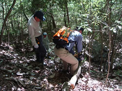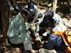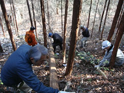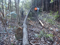 平成14年初めての森入りです。今回は6名の参加があり、今までの活動延べ参加者数は223名となりました。今回の目的は除伐です。森林整備活動もだいぶ板についてきて、それなりに知識もついてきましたのでチャレンジがしたい。そこでクヌギやコナラ等の広葉樹で大きな木(我々にとって)を除伐することにしました。除伐した木は、椎茸栽培のほだ木として活用します。最初は順調に進んでいましたが、トラブルが発生しました。なんと木の切断中に電動チェーンソーの充電が切れてしまったのです。途中から手のこで除伐を再開しましたが、なかなか進まず、メンバーの体力も失われてきました。なんとか交代交代で除伐完了しましたが、その後の処理である玉切りは次回へ後回しにすることになりました。体力を消耗して森をあとにすることになりました。