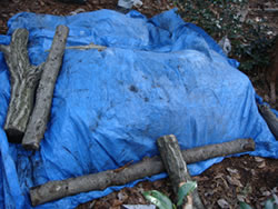 新緑の季節を迎えました。木々が青々としてまぶしい限りです。今回は6名+1匹の参加があり、今までの活動延べ参加者数は237名となりました。今回は前回の続きです。一番大変だったのは、除伐、玉切り後のホダ木運搬作業でした。全部人力で運搬用車両(普通の乗用車)まで運びます。この時期だからか、切りたてホヤホヤのホダ木は重い。肩に担いで運ぶが重労働でした。メンバーの皆様おつかれさまでした。作成したホダ木は、シイタケ栽培箇所に運びました。運ばれたホダ木にシイタケ菌をつけて養生しました。収穫時期が楽しみです。
