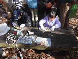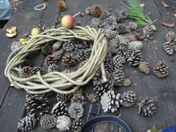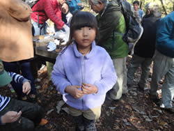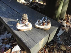 次にドングリや木の実で木工クラフト作りを行いました。事前に用意した材料の他、現地調達した材料を使って作品を作りました。子供たちは豊かな発想でいろいろな物をどんどん作っていきますが、頭の固い大人たちはそれをただ見ているばかりでした。輪切りにした間伐材のコースターに、ドングリや松ぼっくりなどで装飾をし、また、拾ってきたつるを輪っかにして、クリスマスリースを作りました。ドングリのペンダントも可愛いです。子供たちの力作を写真でご覧ください。