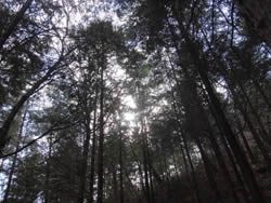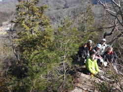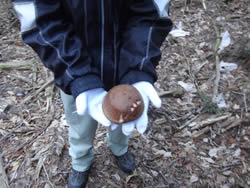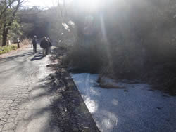 平成15年初めての森入りです。今回は7名の参加があり、今までの活動延べ参加者数は295名となりました。まずは森に年始の挨拶がてら、散策開始。小さな池は厚い氷が張っています。しいたけのホダ木を確認したら、大きなしいたけがひとつ生えていました。生命力を感じさせます。今回の目標は、作業エリア5.0haを一周する散策路を作ることです。意外と険しい山道を歩き、散策路を探す旅にでました。森の上からは町が一望でき、良い景色です。記念に集合写真を撮りました。しかし、山頂付近から1周して戻ってくる散策路が見当たらなかったため、今回は断念しました。次は準備を万全にして再チャレンジがしたいと思います。