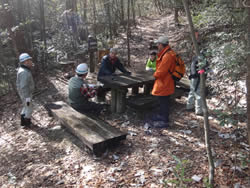 東海自然歩道にある木のテーブルと椅子で休憩しましたが、そこは去年11月に「徳倉・森の教室」の開催場所でした。イベントで作った木のクラフトを発見し、その時の思い出がよみがえりました。残りの時間は、まだ未開発である森の中の枝打ちを行い、本日の作業を終えました。