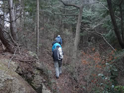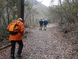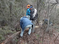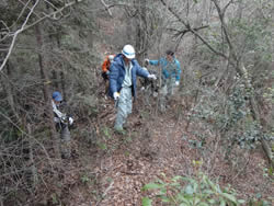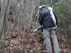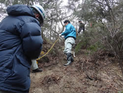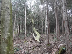 朝礼後、散策路作成のためのロープ等の材料や目印を持っていざ森の中へ。事前準備が良かったのか、散策路がみるみる繋がっていきました。除伐、下草刈り、急な斜面のロープ張り、散策路の目印の設置を行い、散策路が完成しました。これで次回の「徳倉・森の教室」では散策路を皆様に歩いて頂くことができそうです。ただしまめにメンテナンスすることが必要と思われます。森の中には、雷に打たれた木があり、自然の力を見せつけられました。