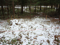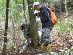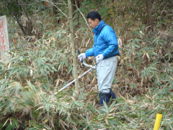 前回、笹が生い茂っているところを刈り払って実験区を作りました。これからもしばらく刈り払いを続け、植生の様子を見ます(右下写真)。
