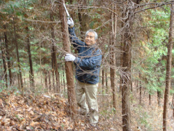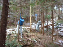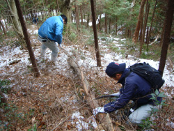 前回刈り払いをした沢筋は見通しがよくなり、さっぱりとしました(右上写真)。ここには治山ダムが何基かあります。刈り払いはまだ上のほうは済んでいませんが、東側の尾根からの斜面の枝打ちがまだ済んでいないので今回はここを集中的にやることにしました。ここは北斜面ですので、沿道や森でもギャップのところはかなり雪が残っていました。枝にはさすがにありませんでしたので私たちは雪を被らずに済みました。枝打ちを進めていく間かなりの数のヒノキの幼木?が広葉樹や潅木に負けているのがよく分かります。まだまだ枝打ちが済んでいない区域も多く、協定の3年間に全て済ませなければなりません。