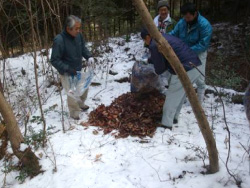 企業の森に参加している社員は農業も好きな人が多く、この森にある落ち葉は腐葉土や堆肥として魅力的であると思っています。そこで堆肥はたとえば外から鶏糞やヌカなど持ち込みますからやめて、今回は純粋に里山の落ち葉掻きの要領で沿道の落ち葉を中心にこれを集め森に堆積し、シートをかぶせて腐葉土作りに挑戦しました。巷に言ういろいろなものを入れないで造るのですからうまくいくかな?いや自然の森の作用であれば黒い腐葉土は1cmの厚さになるには400年もかかるという。そんな簡単に行かないでしょう。