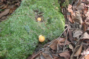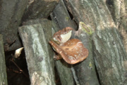 さて期待をしていたシイタケ栽培のホダをみると3枚出ていました。M君が代表して試食することになりまし た。生産第1号です。ホダにはかなり菌が発生していましたが、なお湿り気の多い沢筋へ移動し寝かせました。M君は森の自然生えのきのこの 写真(下の下段)を採っていました。名前はなんと言うのでしょう?