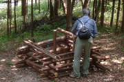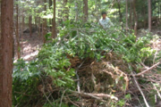中央広場の周囲で参加者が1本ずつ探してみなで確認をして除伐をしました。ヒノキは枝を落とし玉切して後の用材として桟ドロを組んで乾燥することにしました。広葉樹は太くなっているものが多くこの木陰に入っているヒノキが多く見受けられますが、今のところこの森を混交林として扱うつもりで手を入れていません。今回は大きく倒壊しつつ他の樹木の成長の障害になっている1本の広葉樹“ソヨゴ”を伐採しました。年輪を見て少し惜しい気もしました。