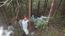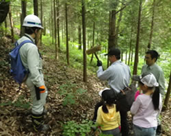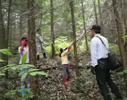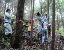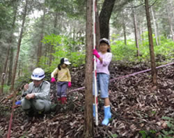 調査範囲を決め、その中に生えている樹木の径および高さの計測を行いました。太い幹や低い樹木など木々の成長は様々です。日当たりや栄養源の供給程度により成長過程も異なってきます。その後、定番の枝打ちを行いました。お子さんも慣れ親しんで楽しんで活動を行っていました。