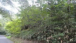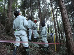 既存エリア含め、合計5haの契約更新を図っています。遊歩道および公衆トイレを目安に新エリアの森の中へ入っていきます。早速、勾配がきつい斜面を登り、いただいた図面をもとにビニールひもで明示を行っていきます。尾根伝いに足を進めるのですが、想像以上に険しい森の中のため、思ったように範囲を特定することができません。事故が起こってからでは遅いので、なるべく平坦な地を選んである程度の範囲を特定しました。次回は既存エリアから整備を進め、範囲を特定していきたいと思います。