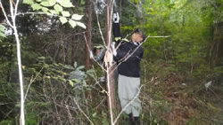 新活動エリア内で10m×10mの区分をテープで明示し、林分調査を行いました。調査は若手の精鋭軍団で結成され、選抜?された5名で楽しく行いました。調査箇所はなぜか厳しい斜面を選択、斜長を考え、区画を測量しました。