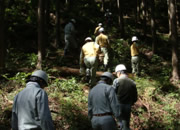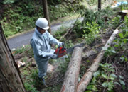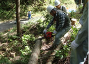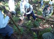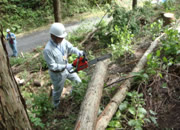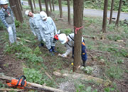 われわれは中電さんの5人と組み、都合10人です。さて木がかりとは特にヒノキなど枝をよく張る木は伐倒させるとき他の木にかかって倒せなくなることで、そのときどうするかということです。まず受け口、追い口を正しく作って、なおかかったときは少し方向の違う木にワイヤーをかけチルホールで引き倒す、場合によっては滑車を使い2本の木を支点に使うなど。また枝の方向が悪ければ木回しで回転させる。木はできるだけ山側に倒す等々。チェンソーを使うのが始めてという人もいて、まずは間伐や木がかりというよりもチェンソーの使い方から習いました。森林組合の方々には親切に、われわれが納得するように教えていただきました。われわれの班で都合直径20cmほどの杉を7本ほど倒しました。木がかりしたのはそのうち3本ほどだったでしょうか。木の間を縫って見事に倒れたときは拍手です。作業は午前、午後2時間ほどです。