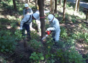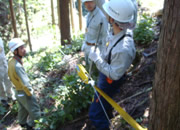 今回の行事は森林の保育作業に必要な間伐の木がかりを学びました。10人ほどが班を組み3班が森に入りました。